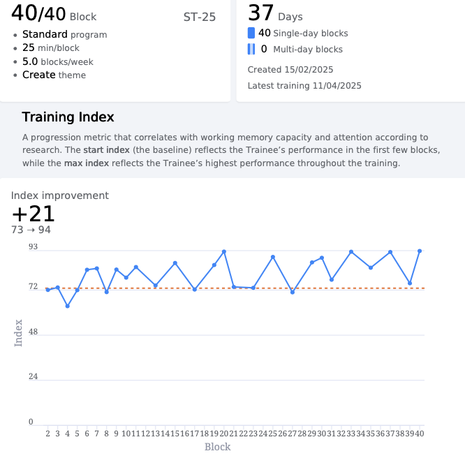 GAINS: Starting Index 73 increased to 94 = 21 points. 1Y 8M Working Memory Improvement.