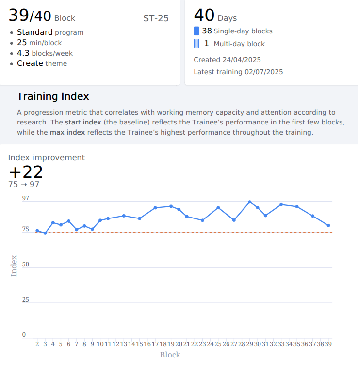 GAINS: Starting Index 75 increased to 97 = 22 points. 1Y 8M Working Memory Improvement.