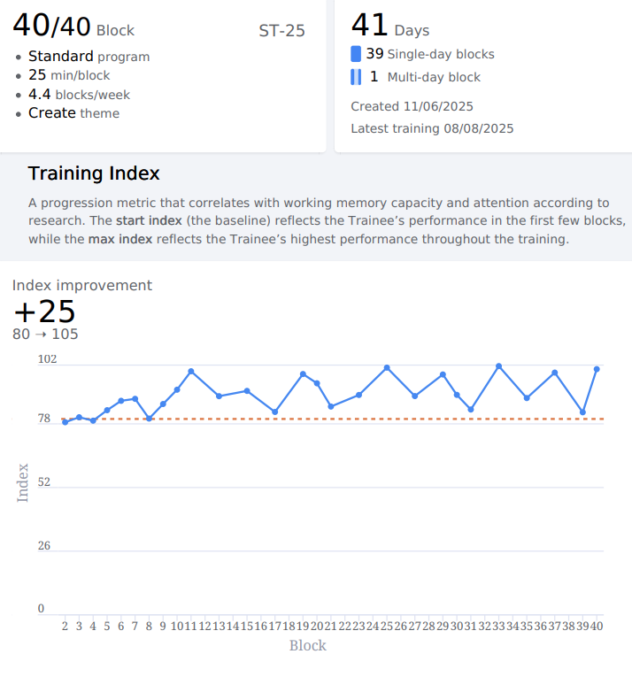 GAINS: Starting Index 80 increased to 105 = 25 points. 2Y 0M Working Memory Improvement.