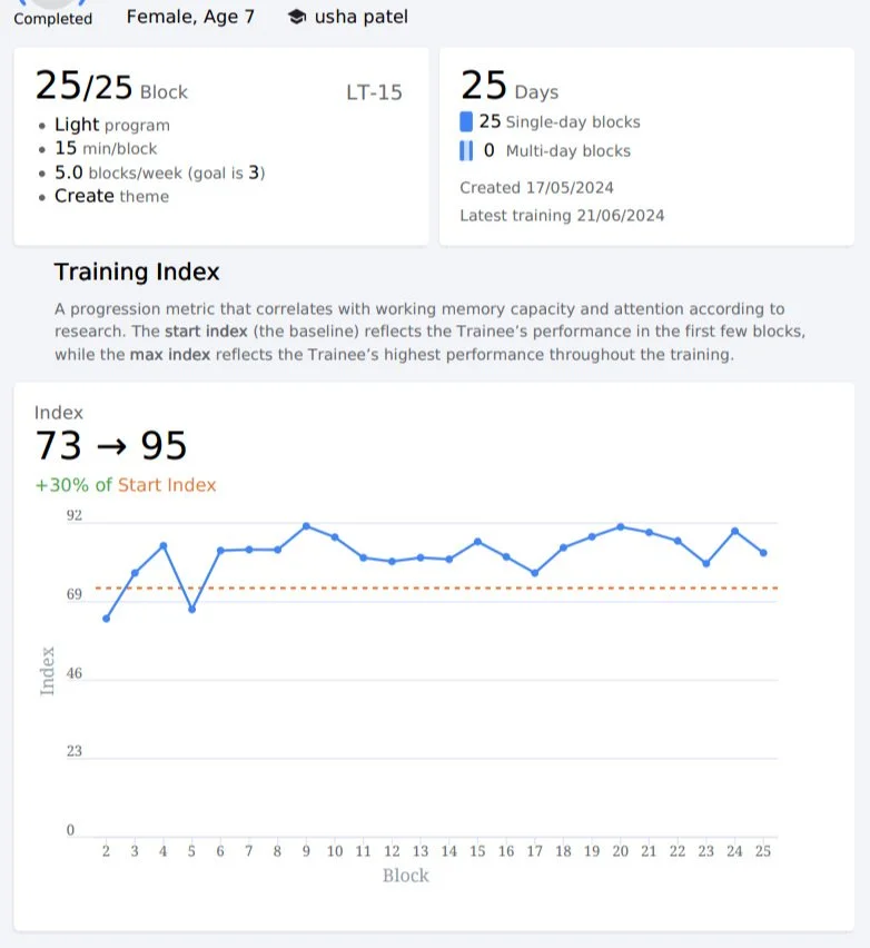 GAINS: Starting Index 73 increased to 95 = 22 points. 1Y 8M Working Memory Improvement.